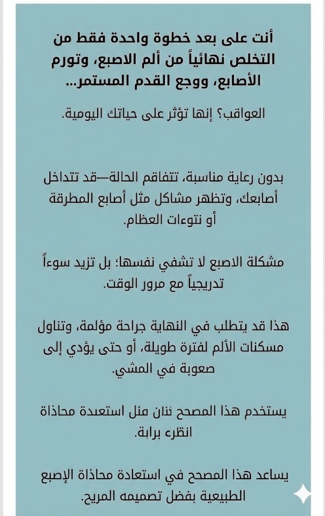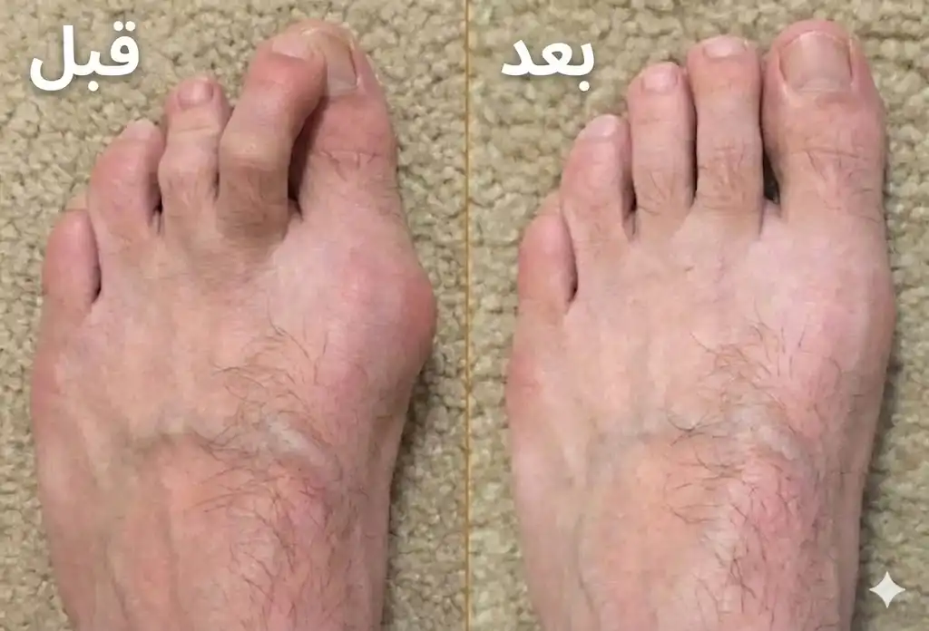 النتائج المتوقعة: تلاشي الألم خلال 7 أيام، وتحسن ملحوظ في استقامة الإصبع خلال 30 يوماً، ومع الوقت ستستعيد عضلاتك قوتها لتعود قدمك لشكلها الطبيعي.